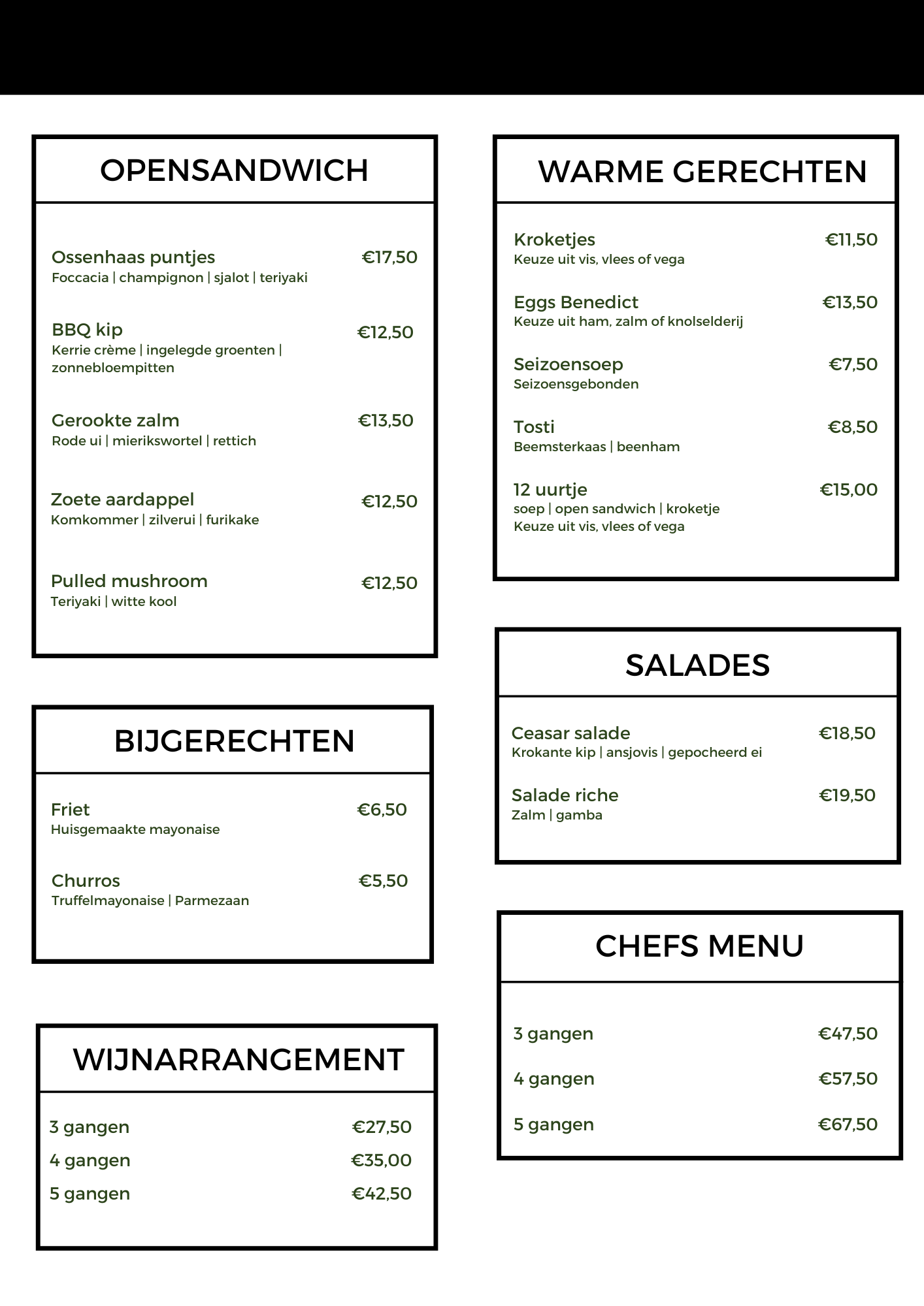 Wij serveren een verrassingsmenu dat wisselt met het seizoen en de beschikbaarheid van producten.
